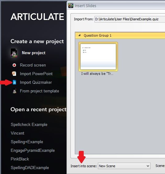 If you're importing questions into an existing course, it should be pretty similar. To import into an existing course, click on the Articulate "A" menu in the top left-hand corner of the window. Then, click on "Import" and "Quizmaker". After selecting the file, you'll see a similar prompt that will allow you to insert the questions into a scene.