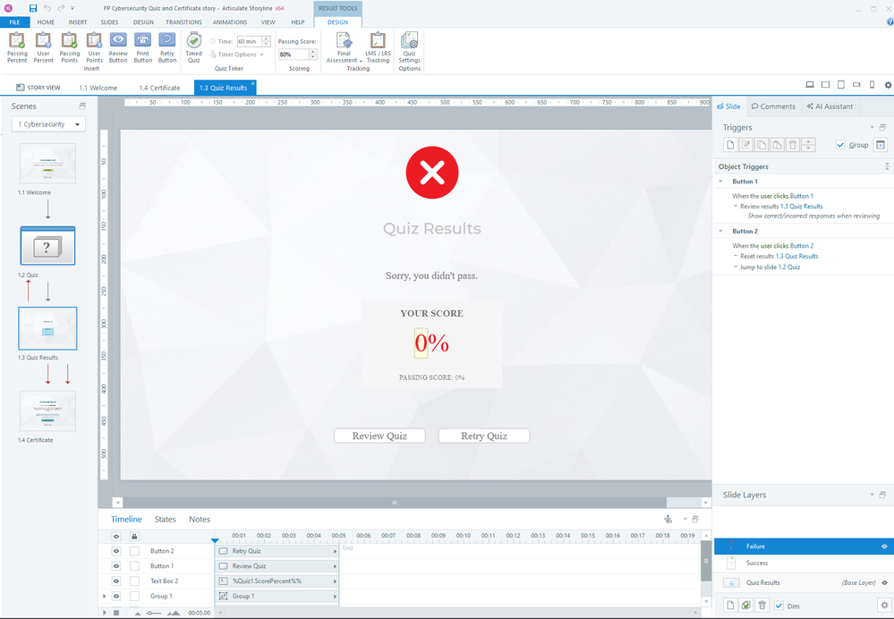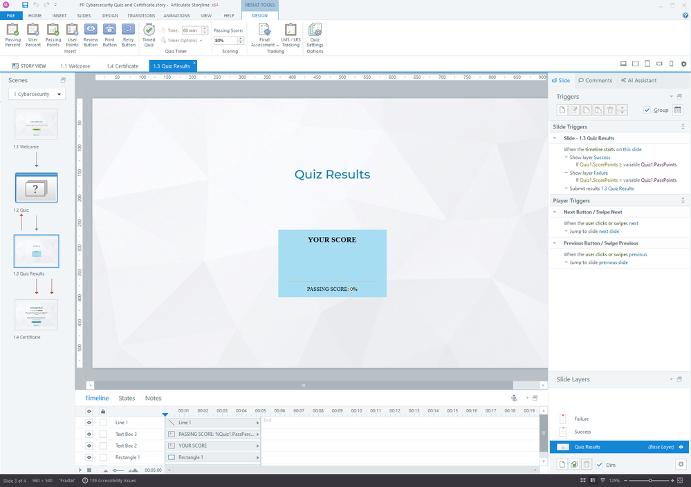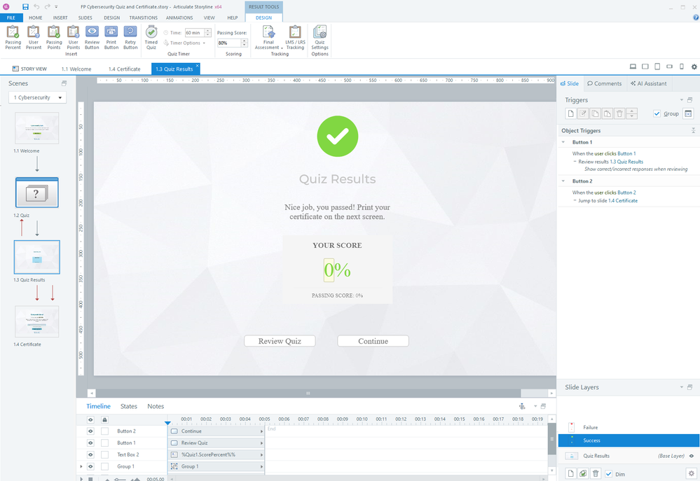 All our quizzes are set to pass with a score of 80% or greater. If they are passed, then the person can proceed to the next slide and generate a certificate, which also sends us their results via Power Automate. If they don't make at least 80%, then they will have to retake the quiz.
