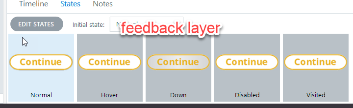 If I create a brand new project, and add a multiple choice question, and then look at the states for the Continue button on the Correct feedback layer, here’s what I see (notice the Down state):