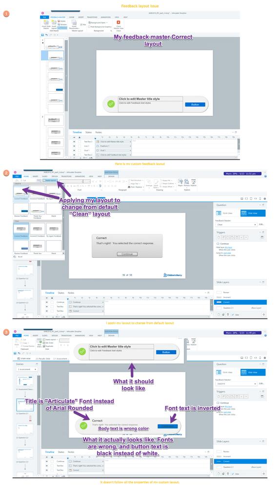 What appears as my feedback masters are completely different from what shows up when a quiz slide is created. This is so snake-bit I don't even know where to start. Please just take a look at the Word doc which tries to show the problem, and the example storyline file that demonstrates the problems.
