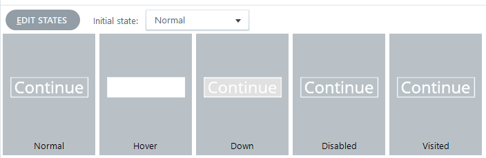 If I create a brand new project, and add a multiple choice question, and then look at the states for the Continue button on the Correct feedback layer, here’s what I see (notice the Down state):
