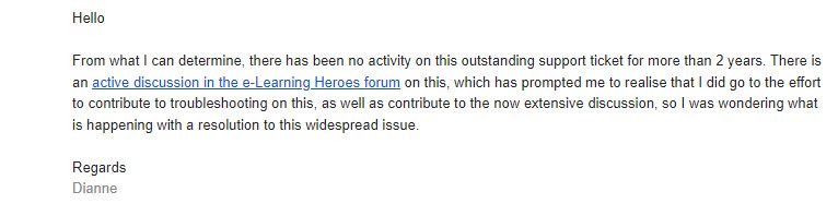 I really don't think this can be considered 'low impact' as I was previously told, and can't imagine this is a difficult issue to resolve. Please, please support - can we work at ticking this one off your list. :) :)- DianneHopeCommunity Member