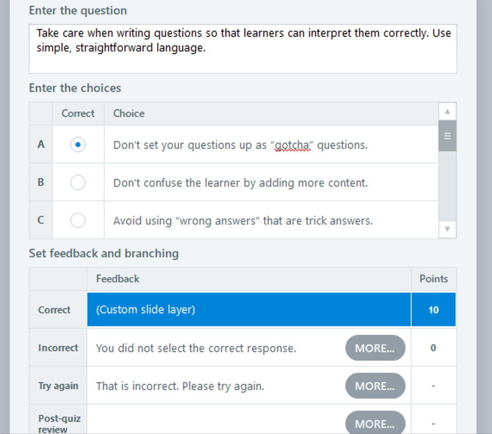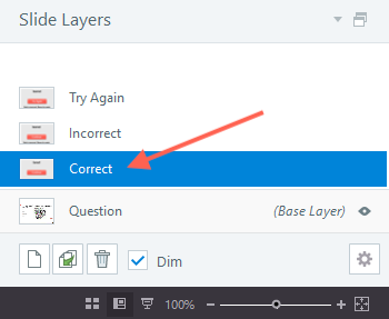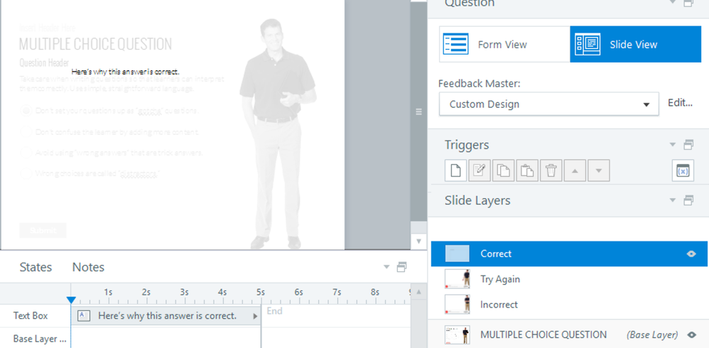 3. Create new layers titled, Correct and Incorrect. Choose your custom feedback layout with the text placeholder, and then enter the text appropriate for that slide's feedback.
