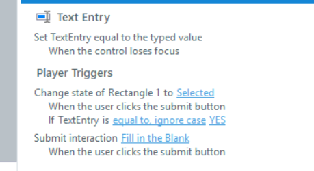 is this what you mean - see Peek video. I have a rectangle shape at the bottom of the screen. When the user completes the FITB and clicks Submit, the rectangle changes from purple to orange...or did you want the text entry field to change state?