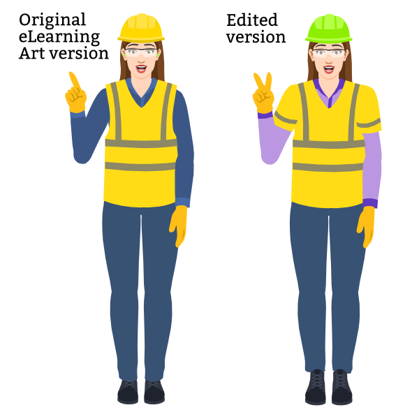 For example, I had a safety training project where we needed to customize the PPE. The hard hats needed to be a specific color, the safety vests needed to have sleeves, the shoes needed to be visibly lace-up shoes, but they didn't need ear plugs. I was able to customize that and edit the characters to meet those specific requirements. I was even able to edit the hand to show 2 fingers up instead of 1 for a particular slide.