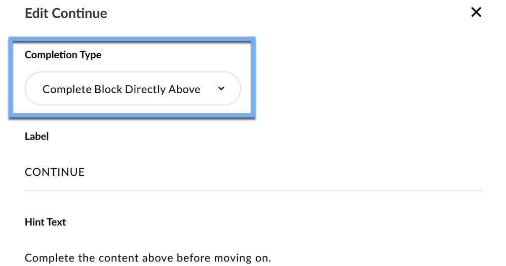 You can modify the settings for a Continue Block by clicking Content > Completion Type (Complete Block Directly Above).