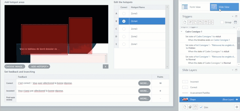 De plus, la zone correcte ne mène pas toujours à l'écran de bonne réponse (si on clique sur la bonne zone au 1er coup, c ok ; sinon il ne la considère pas comme une zone de bonne réponse). Le déclencheur Valider la zone de clic se déclenche au clic de l'utilisateur sur la bonne zone.