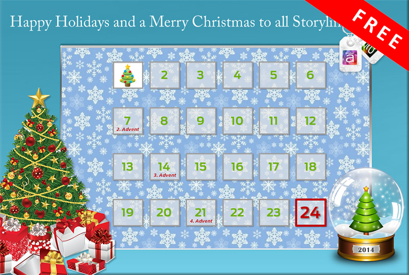 Hi, here is a free advent calendar for Storyline 2. The file provided as is, but you should be able to switch out the current placeholder Vimeo videos with content that works for you, replace bitmaps, add your logo, etc. The trigger setup might be a bit messy, I was on my third cup of eggnog when I built this!