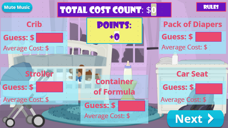 I'm working on a game show style interaction where learners guess the average cost of items and get points for accurate guesses.