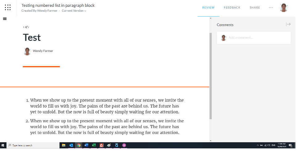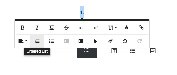 - In Text block 2's Heading. Enter "2." and Spacebar to repeat step 3 above. It will format this Heading into a list item.