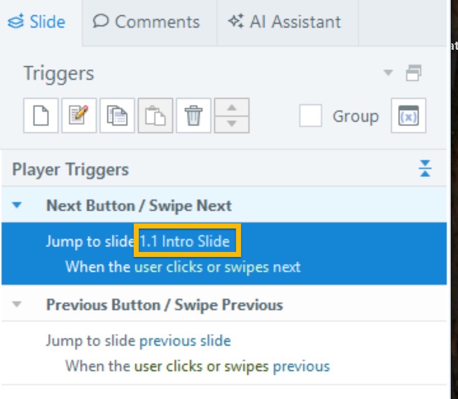 It's possible they meant that when setting a trigger, select Jump to slide and choose the first slide you created. In this example, I set a trigger to Jump to the Intro slide, which is the first slide I created.