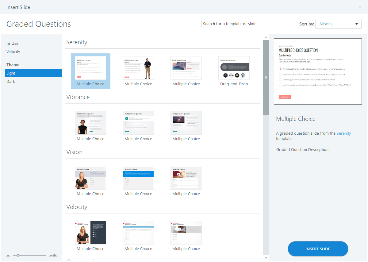 I'm using SL360 and when I used to insert a graded question I used to be able to pick from all the types, T/F, multiple choice, etc, but now when I try to insert a graded question I just get this screen and I'm not seeing a way out to get my other question types. What am i missing? I'm using my own layout not the Velocity one indicated in the "in use" area. This is slowing me down...