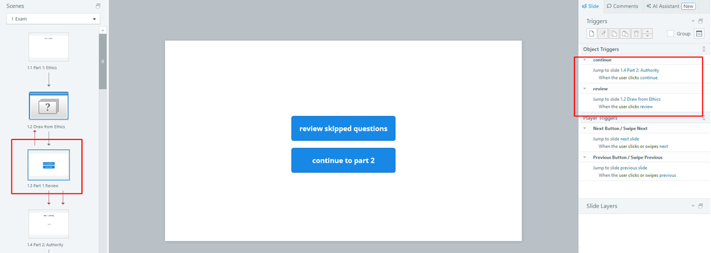 I encourage you to apply these necessary changes to the rest of your Draw from Question Bank slides, including adding an intermediate slide. To connect the Draw from Question Bank slide to the intermediate slide, switch to Story View and update the trigger to point to your intermediate slide.