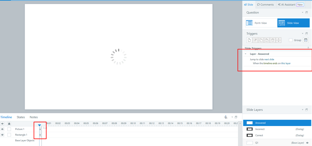 I have also added a small loading GIF on the Answers layer to enhance the user experience. This provides visual feedback while Storyline searches for skipped questions, especially when there are many in the Draw from Question Bank slide, instead of just displaying a white rectangle for a few seconds.