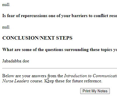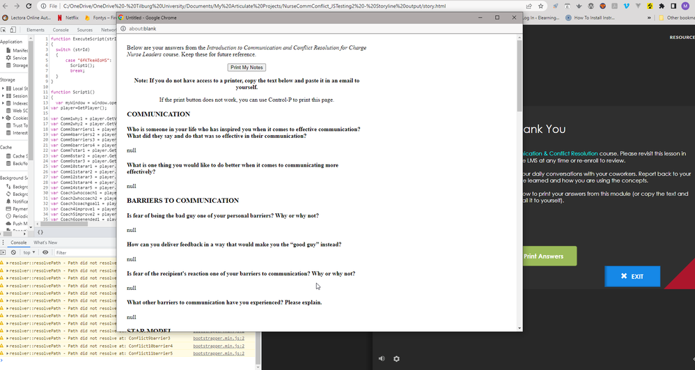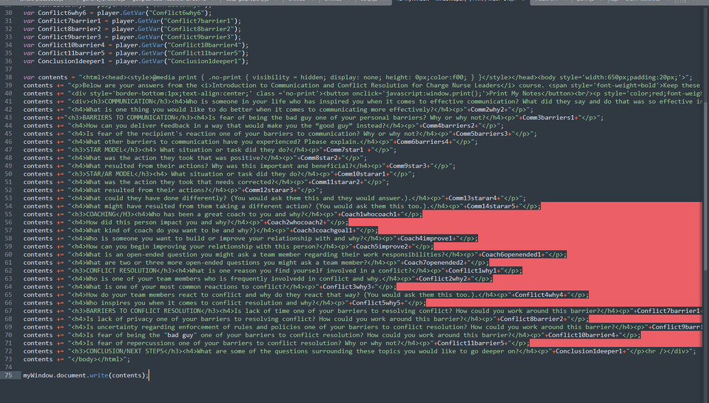 I'm trying to pull multiple text entry answers so the learner can print them all at the end of the course. It's code I've pulled from another course that works perfectly in that course, but somehow is not working in this new one.