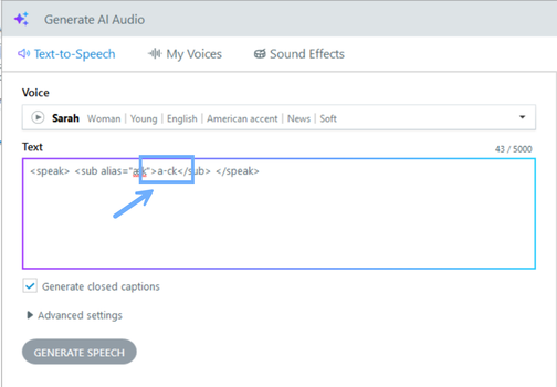 <speak> surrounding text <sub alias="æk">a-ck</sub>surrounding text. </speak>