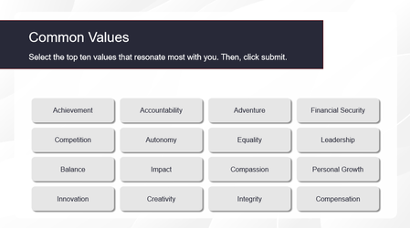 I need the user to select 10 out of 16 possible personality traits. On the next slide, I will display the 10 the user selected and have the user then select 5 out of the 10 that they selected. The l...