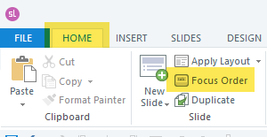 Selecting the option will open the Focus order panel allowing you to change the reading order of all assistive technology visible elements on the slide. You can also use this panel to remove elements that should not be visible to assistive technology.