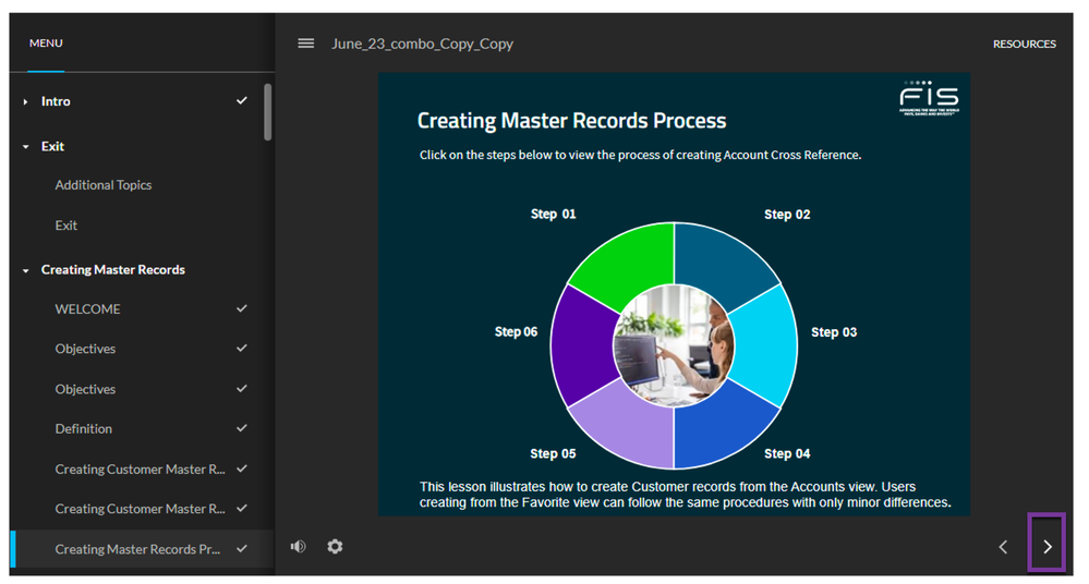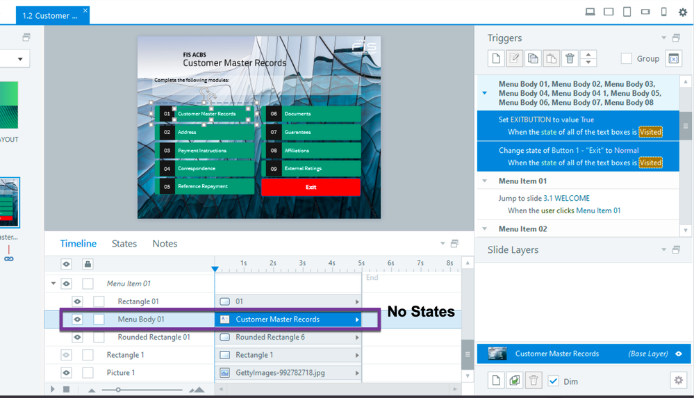 Also, you have the variable set to adjust on the states of the text boxes, but there are no states on these items. The states, still no visited state, are listed on the Rounded Rectangle Shapes. So, the variable is not adjusting, which is why you do not see the Exit button. - The disabled next button on the steps slides is no longer working when all of the scenes are gathered together in a larger file.