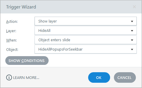 2. If that doesn't work, you can add an empty layer, let's call it "HideAll" . You can then add an invisible rectangle named "HideAllPopupsForSeekbar" onto your timeline and extend it according to where you want the layers to hide when using the seekbar. Then add the trigger shown in the attached HideLayers.jpg
