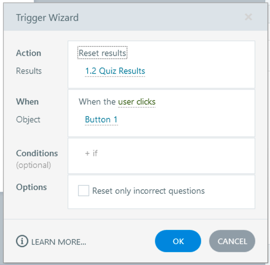 - Use a Reset Results trigger to clear any previous submitted attempts, and allow learners to retry a quiz. Note that this will clear all attempts from previous question slides as well.