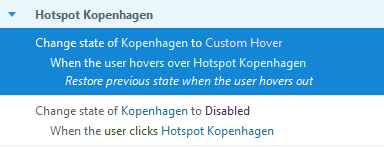 I want to achieve that when the user clicks the image, the hover state no longer works and the image remains in its selected state. So I created a 'disabled' state. When I click the hotspot the disabled state is activated. However, when I move the mouse outside of the hotspot area, the image goes back to its original (normal) state.