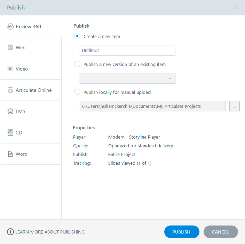 I am using Articulate Storyline 2. I have created a first little video, and I wish to publish it for my users.