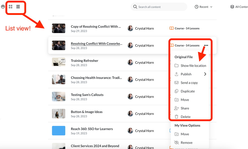 If you are looking at the course card in My View, you'll see the option to Show file location. Once you navigate to where the course lives in your folders, you'll see all of the normal options.
