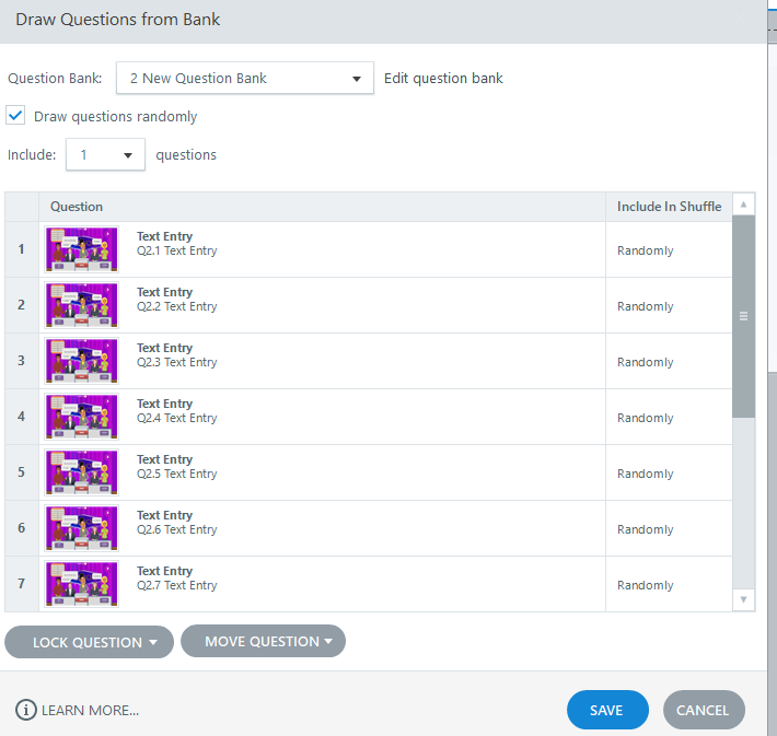 By using Storylines built in Question Bank functionality, there is no limit to how many times I can duplicate the original slide and have it included in the random draw.