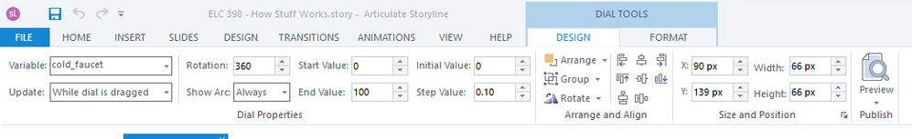 You might notice that the variable for the knob (the dial) and the variable for the slider are the same. Also the range and initial value are the same. Why? This will allow us to control the slider by changing the value of the knob (by rotating it. Under formatting, I also changed the dial face to be a picture of a faucet knob (cold).