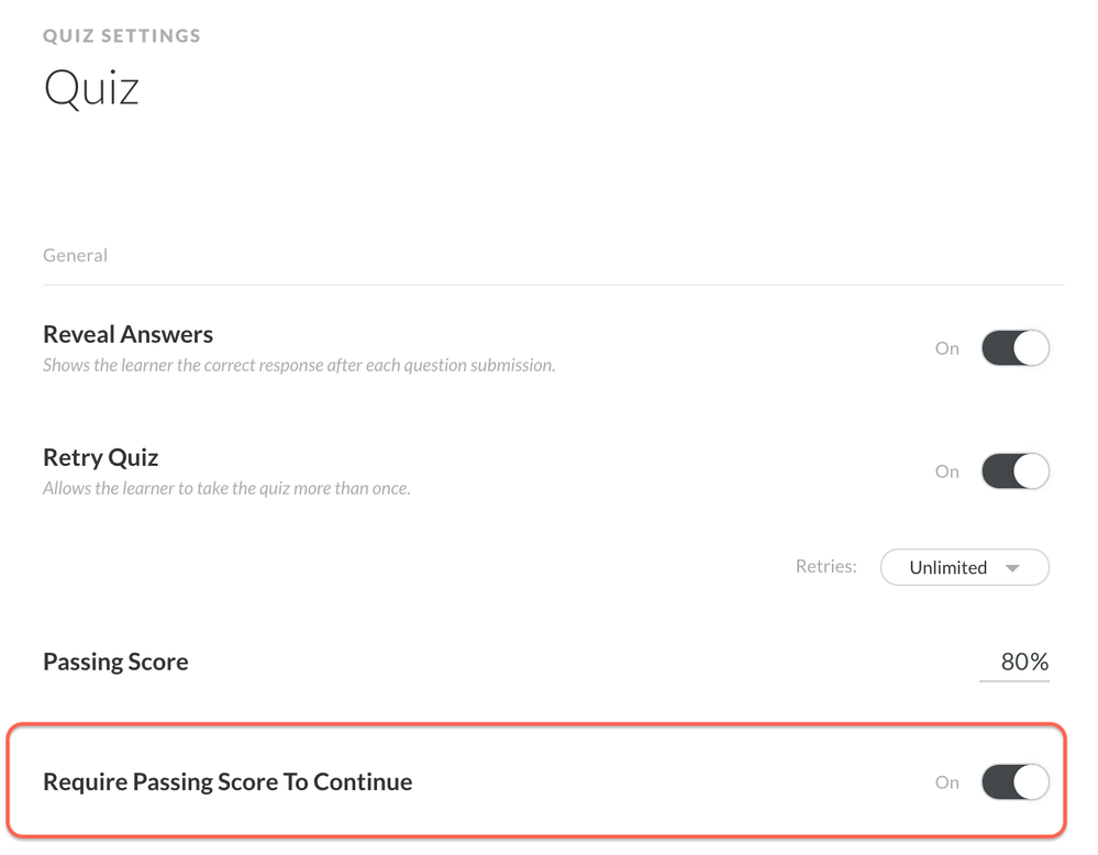 Rise does have a feature that will allow you to force learners to pass the quiz before moving on to the next lesson. You can find that feature under Quiz Settings.