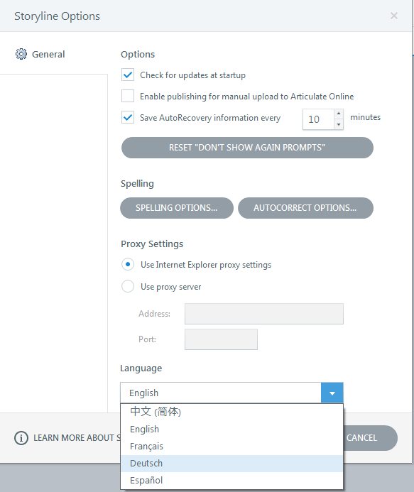 If you are using Storyline 360 (current version), the language selection option is in the desktop app under Preferences.
