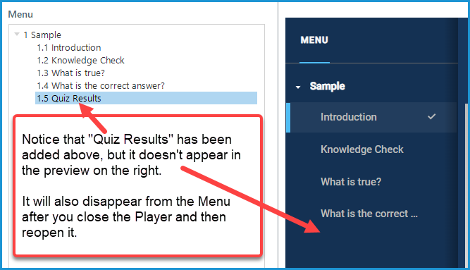 Judy - I totally didn't realize that, so did a quick publish test and for sure you are correct :D I never really had a need to include it in the menu, so the more you know! But your work around is perfect - just replicate the slide as a non-result slide. Great workaround.