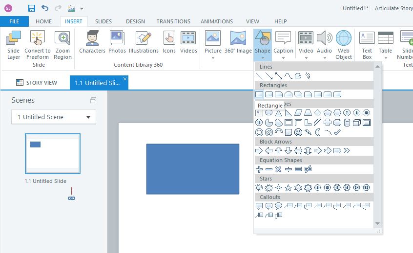 - open a new project, insert a new shape (e.g. a rectrangle)