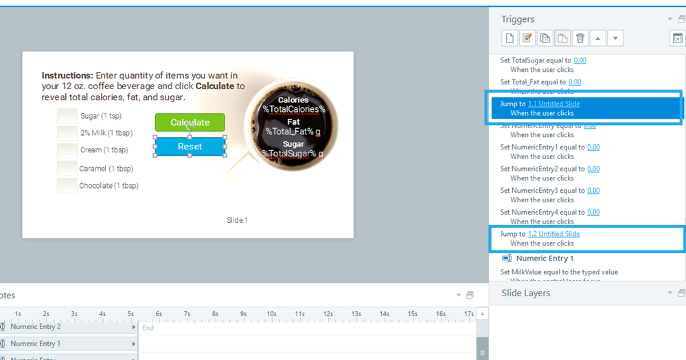 The slide would not reset back to its initial state: This was happening because you were mixing your variable references. In the trigger panel, I saw the first numeric entry referenced as NumericEntry and as SugVal in another instance.