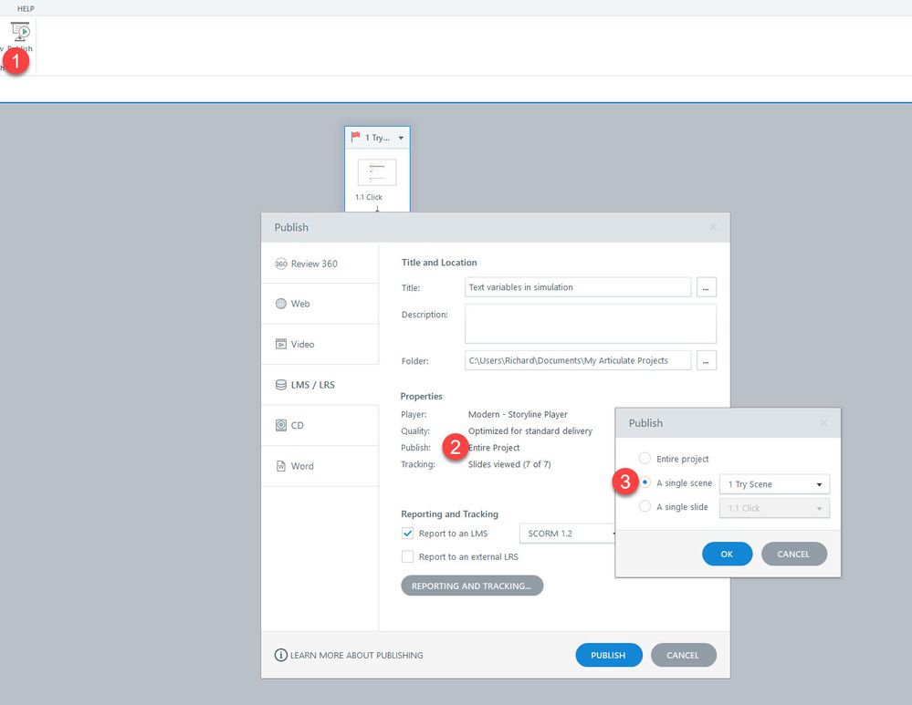 If I understand your question correctly, you want to publish a specific scene from your Storyline project? If so, click Publish (1) , click the text to the right of Publish (2)  and change it to A single scene (3). Select the scene you want to publish and click OK. You can then upload the files to your website and point the hyperlink to the story.html file.