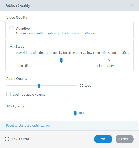 -Adaptive Video Quality from the SL360 Publishing menu is amazing for user experience, BUT extremely bad for very large video files because it will render out multiple different quality versions of your huge video file, which will both make the zip enormous, and also dramatically extend publishing time. Static is your friend for testing. I've found 7 to be acceptable for rich animated video content. 5 is perfectly fine for a lot of video content that doesn't have a ton going on besides captures from slide decks and screen captures of people demoing stuff on web browsers etc.