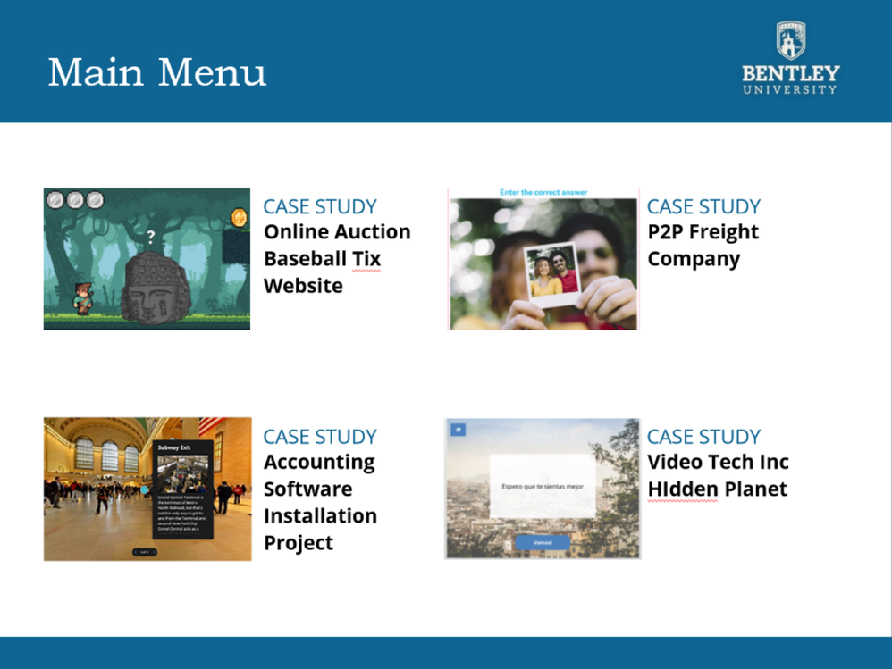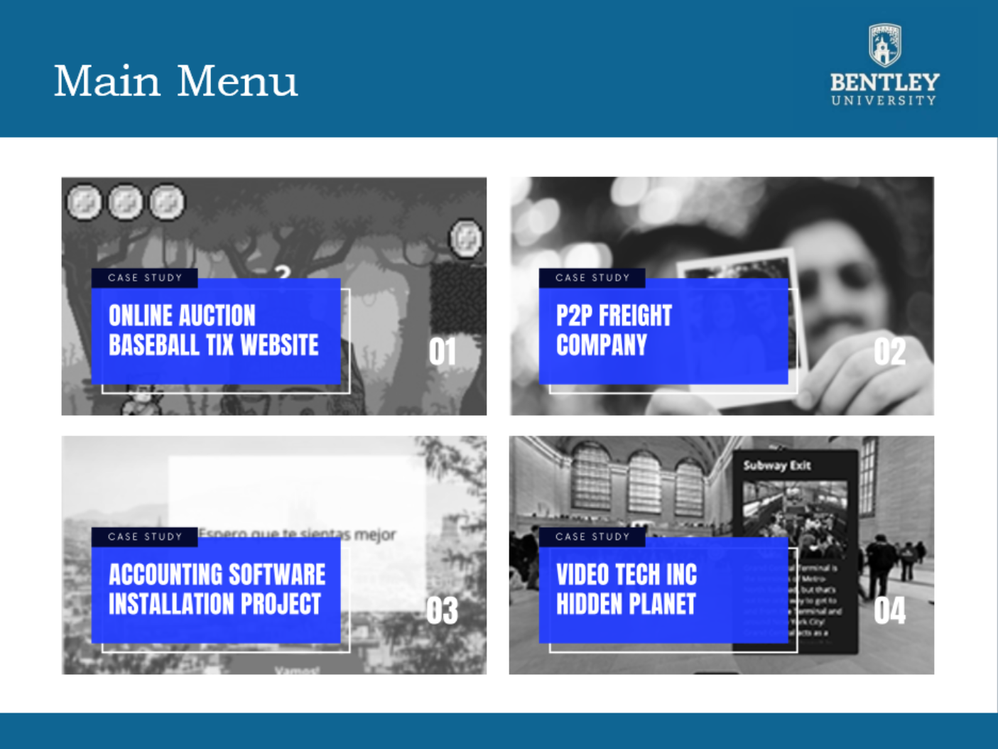I am looking for ideas to make this Main Menu look more visually professional. This is an Articulate course with four distinct case studies. I created two of them using an animation software. All four are MP3/MP4 videos. The thumbnail of each case links to the videos.