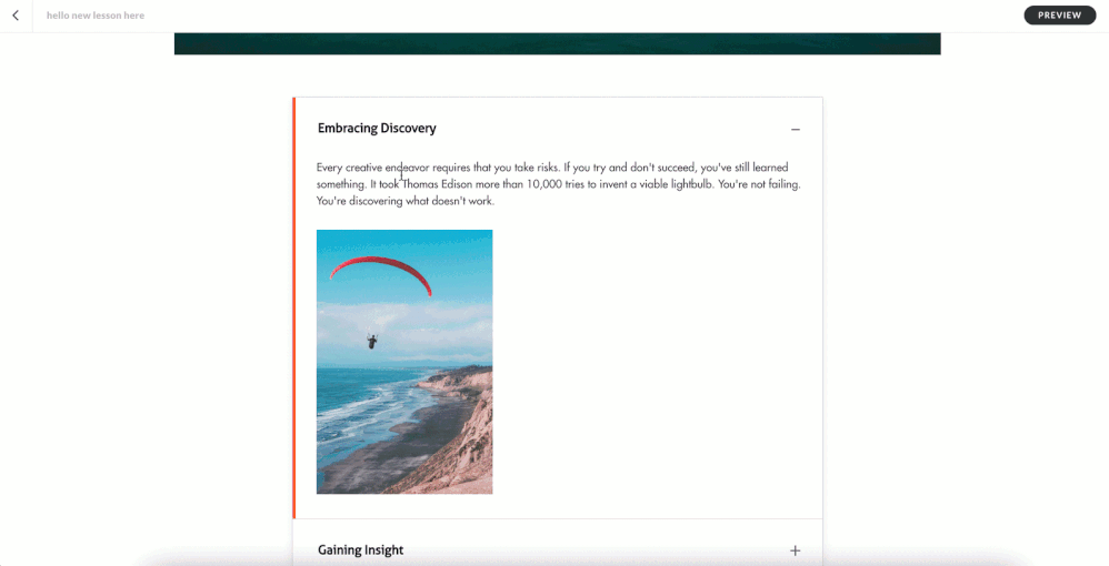 Thanks for sharing your voice with us! We understand you’d like the option to place the image above the text so it can catch attention before the copy in Tabs Blocks. Since this layout isn't currently possible, I've shared this with our product team so they know how important flexibility in image placement is for your lessons. We'll share any future updates in this thread so all are in the loop!