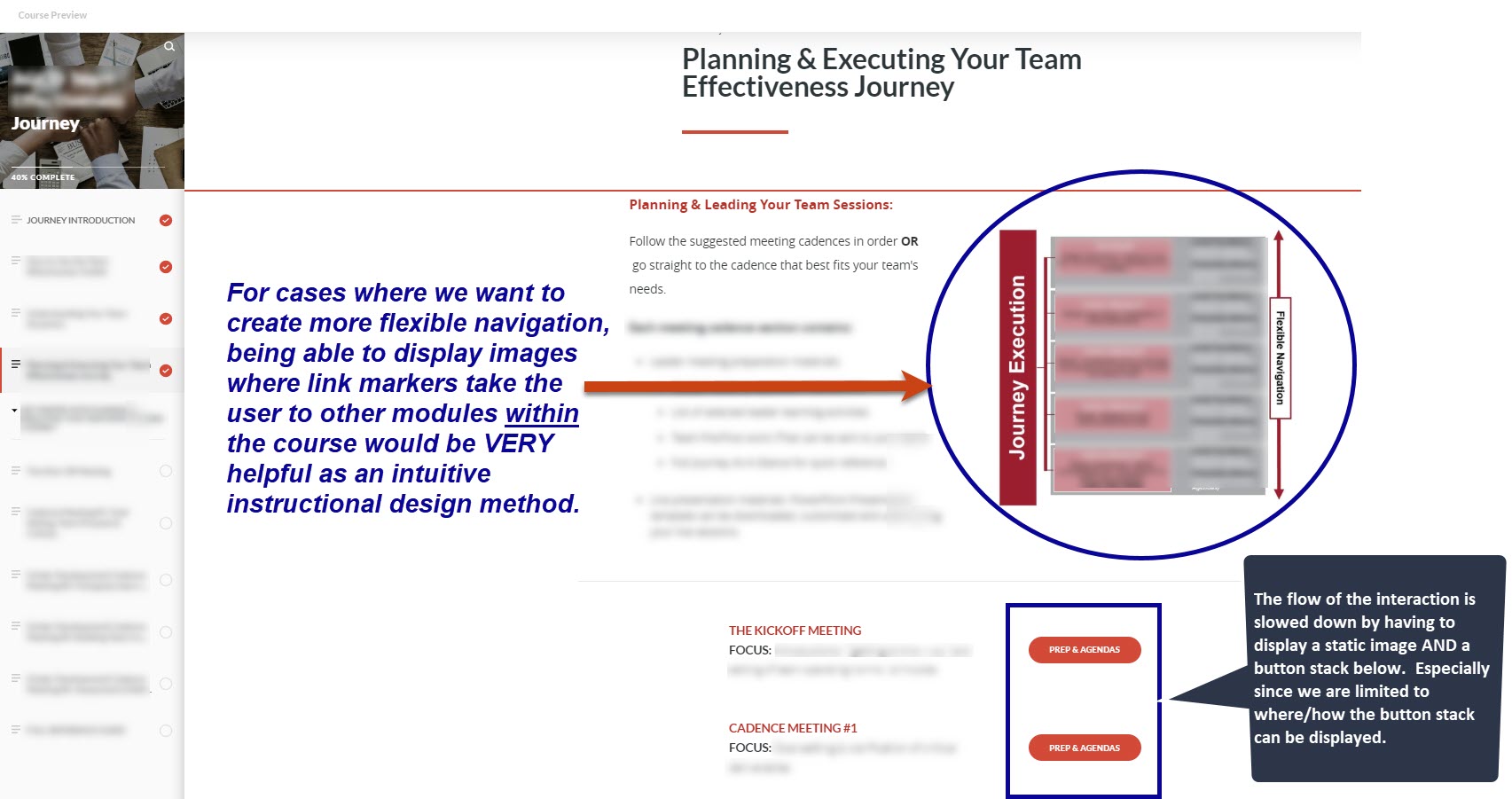 We love RISE as a rapid development tool and COMPLETELY understand that the goal of the tool is to be LESS complex than StoryLine which has the most functionality, but is also more difficult to learn and develop in. However, adding image marker hyperlinks that link to internal modules seems like more of a basic function. It must be that it would require a great deal of back-end coding and/or structural changes for each module to have it's own addressable footprint.