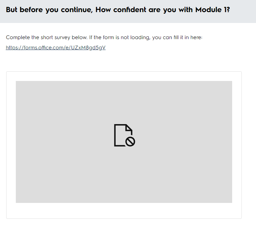 A block of text saying Microsoft 365 Forms with a link is inserted. It is not embedded, it is a link that takes you out to the form.