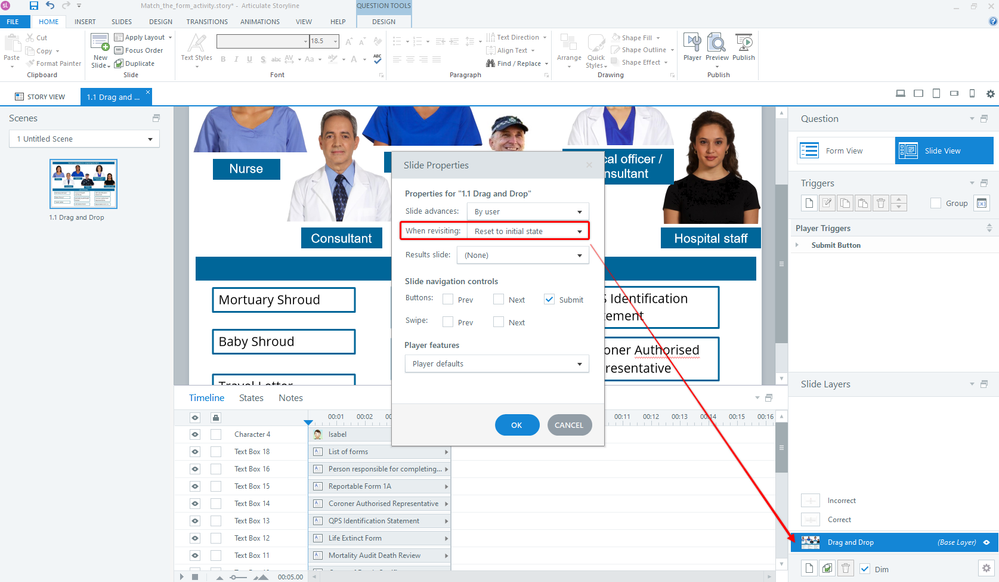Now, when the learner incorrectly answers the drag and drop interaction they will get the pop-up from the incorrect layer. When they click on continue, it will send them to the same slide. This is considered as revisiting the slide and since we have revisiting set to reset to the initial state, the drag and drop interaction will reset the position of the blocks to its initial state. Does this answer your question?