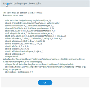When I am trying to import a PowerPoint presentation to storyline, I am receiving an error message that states Exception during Import Powerpoint. The value must be between 0 and 21600000. Paramet...