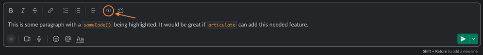 Hi, this is a very needed feature for us too! Would be great if you can allow us to highlight code in normal paragraphs. See how Slack does it:
