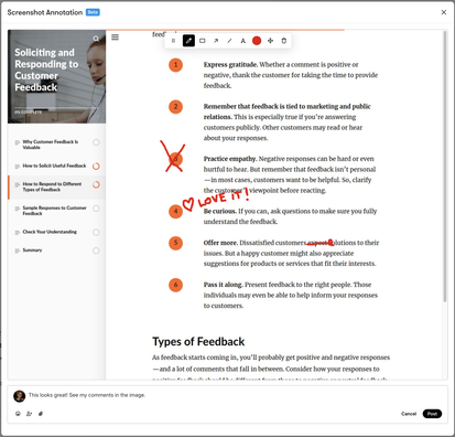 Hi! My stakeholder has used this feature on a Microrise course, but her written notes on the annotated screenshot are cut off in the version that's submitted for feedback. I've had to go back to her and ask her to write her comments in full.