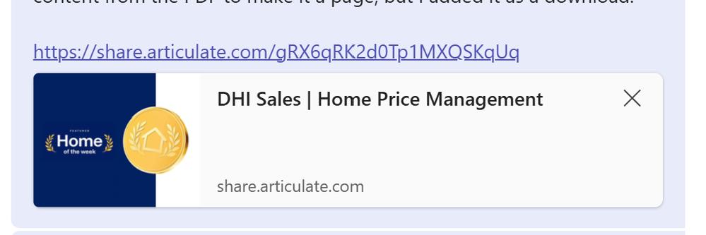 The problem isn't with the playing. I don't include an image in the headers. The problem is when we send the link out to share it - the link adds a picture. It will include either the default image or the image I've added in the theme. And, I noticed recently it happens with quick share regardless if it is a micro learning or a full course. I also noticed if I create the course, add a content and save it, then later change the image it will only hold the original image. If on creation right after the first lesson is added and theme is available, if I change the image then it will keep the new image, any time after that I change the image it onlys shows the first image.