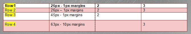 As an explaination: Row 1 and 2 can be changed in height. Row 3 and 4 can not, because there are empty cells in the row. Row height and margins are in the image. Also see what happens with marked text as it crosses into the cells above and below.