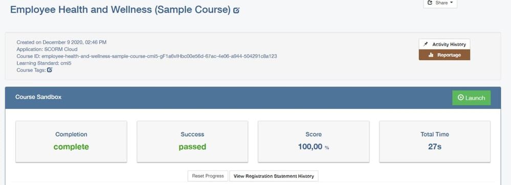 I have captured a Peek video of this. Long story short, all the cmi5 verbs are sent correctly, yet the SCORM Cloud doesn't save the scores. The only score which is saved is the Total Time, and only during launches subsequent to the first (during the first launch the Total Time data is not saved).