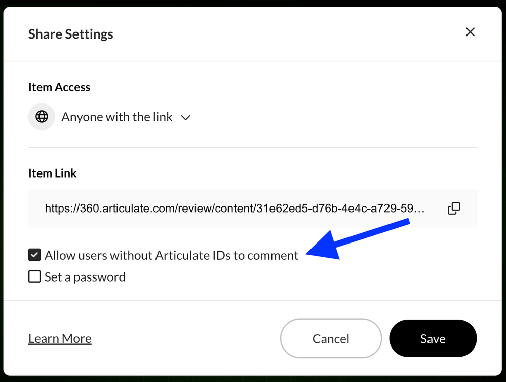 If you have the option enabled to "Allow users without an Articulate ID to comment", then your client should have no trouble leaving comments on your course.