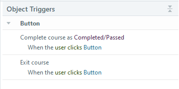 Thank you so much! Your screen shots are very helpful. I have similar object triggers at the end of my storyline courses, but I do not have a specific exit slide with the "Complete course as Complete/Passed"